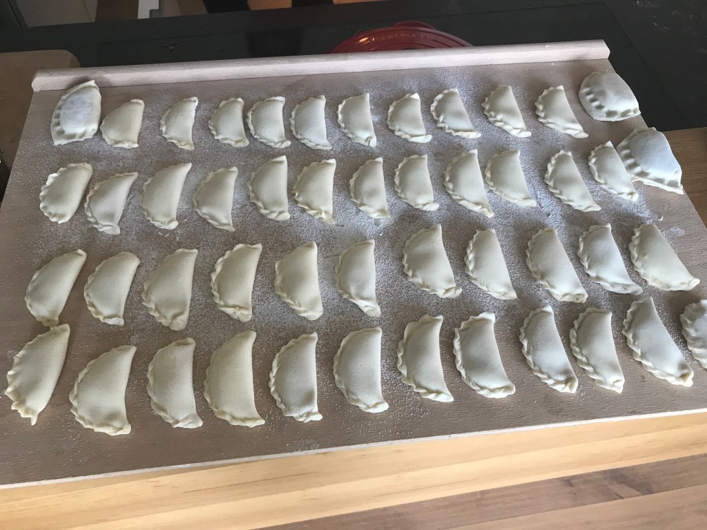 Angelehnt an die italienischen „Mezzelune“ hab ich einen Teig genommen, mit dem ich Erfahrung habe, nämlich von den Kärntner Nudeln. Die Fülle ist herbstlich und könnte je nach Jahreszeit angepasst werden. Die Herstellung ist zwar ein bißchen Bastelarbeit, aber keine Hexerei – und die Gäste beeindruckt man auf jeden Fall 😉