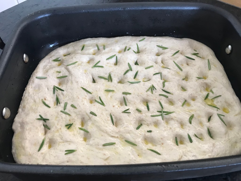 1 EL Olivenöl auf dem Teig verteilen und mit den Finger Dellen in den Teig machen und anschließend mit den Rosmarinnadeln bestreuen. Den Teig nochmals rund 30 Minuten gehen lassen, bis er deutlich aufgegangen ist.