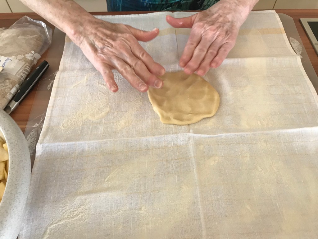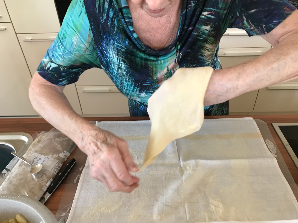 Den Teig auf einem bemehlten Tuch hauchdünn ausziehen. Dazu zuerst breitdrücken, dann über den Handrücken formen und zuletzt am Tuch in eine rechteckige Form ziehen. Die dicken Ränder mit einem Messer abschneiden und entfernen.