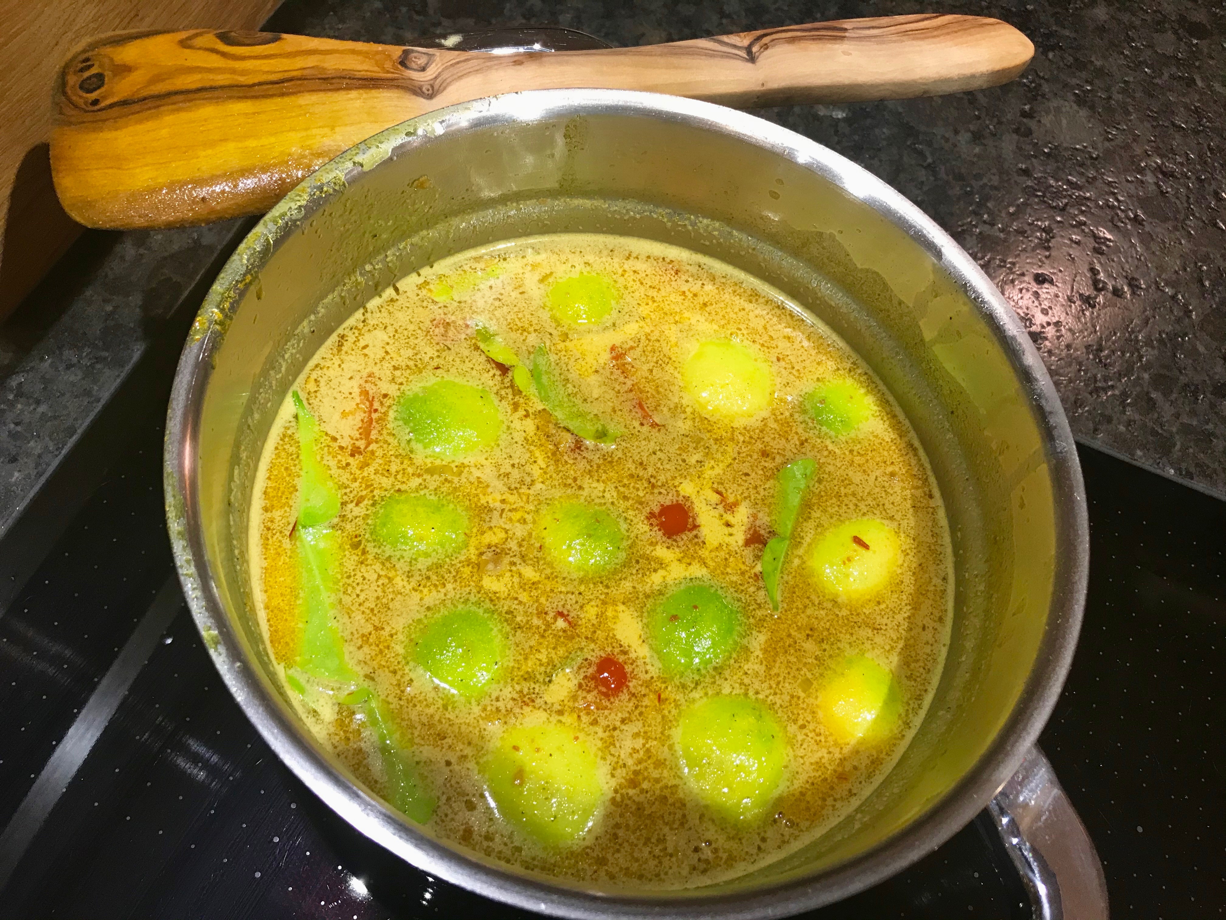 Mit Kokosmilch und Gemüsebrühe aufgießen, halbierte Cherrytomaten, geviertelte Limetten, gehackte Chilis und ganze Limettenblätter zugeben. Mit Salz, Pfeffer, Kokosblütenzucker, Safran und Schwarzkümmel würzen und 20 Minuten köcheln lassen.