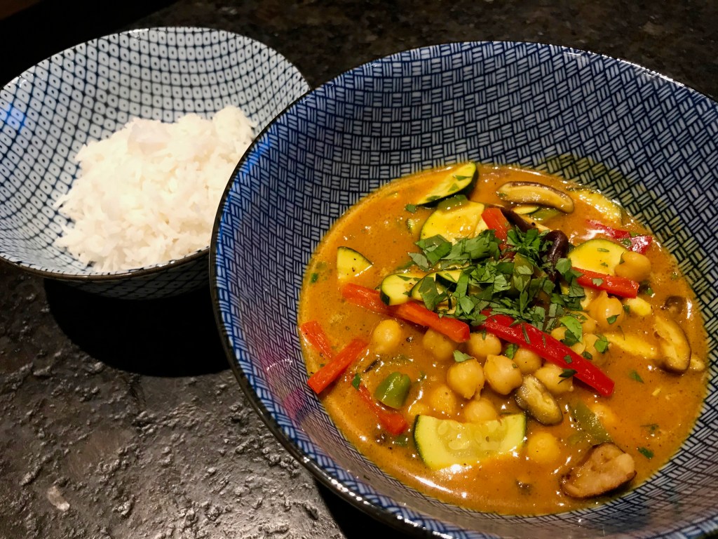 Daraus läßt sich ein Fisch-, Hühner-, Kürbis- oder Linsencurry zubereiten. Der Phantasie sind keine Grenzen gesetzt. Ich hab in meinem Beispiel ein veganes Kichererbsencurry gemacht.