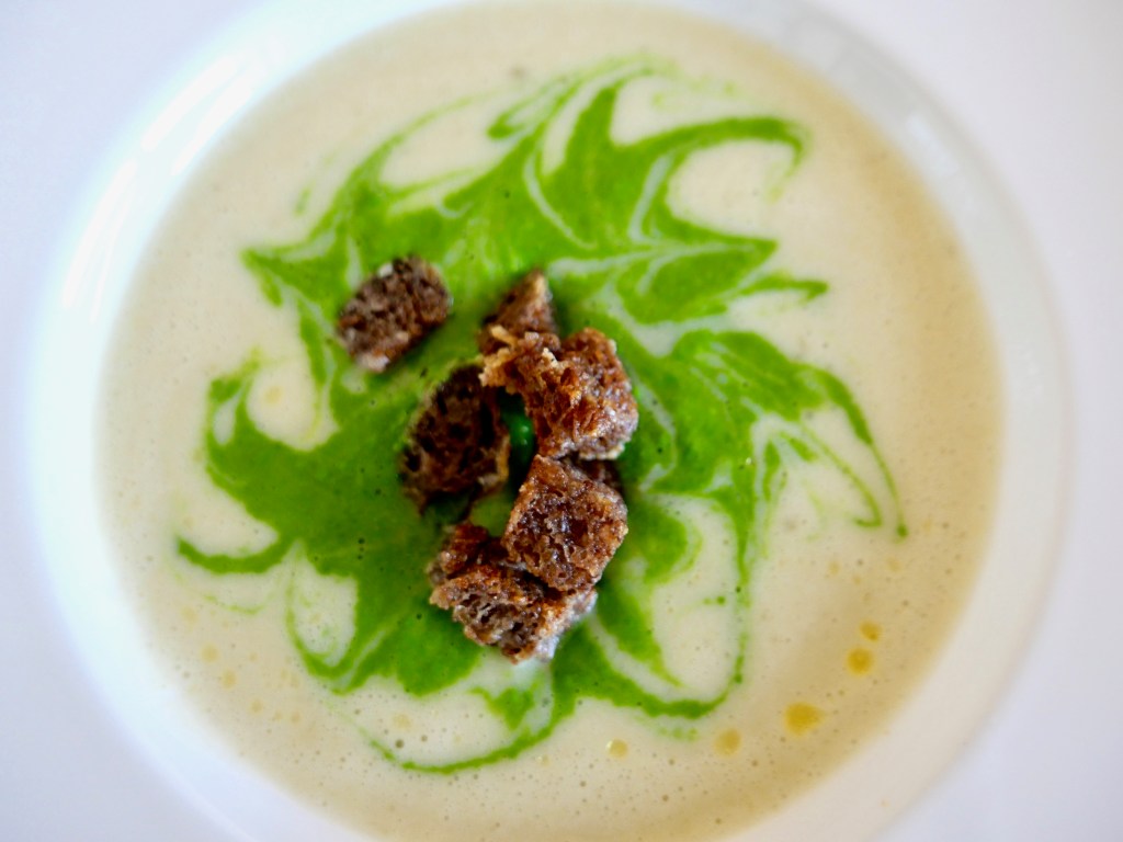 Suppe in Tellern anrichten, einen kleinen Schöpfer Spinatsauce in die Mitte geben und mit einem Stäbchen zu einem Wirbel verzieren.