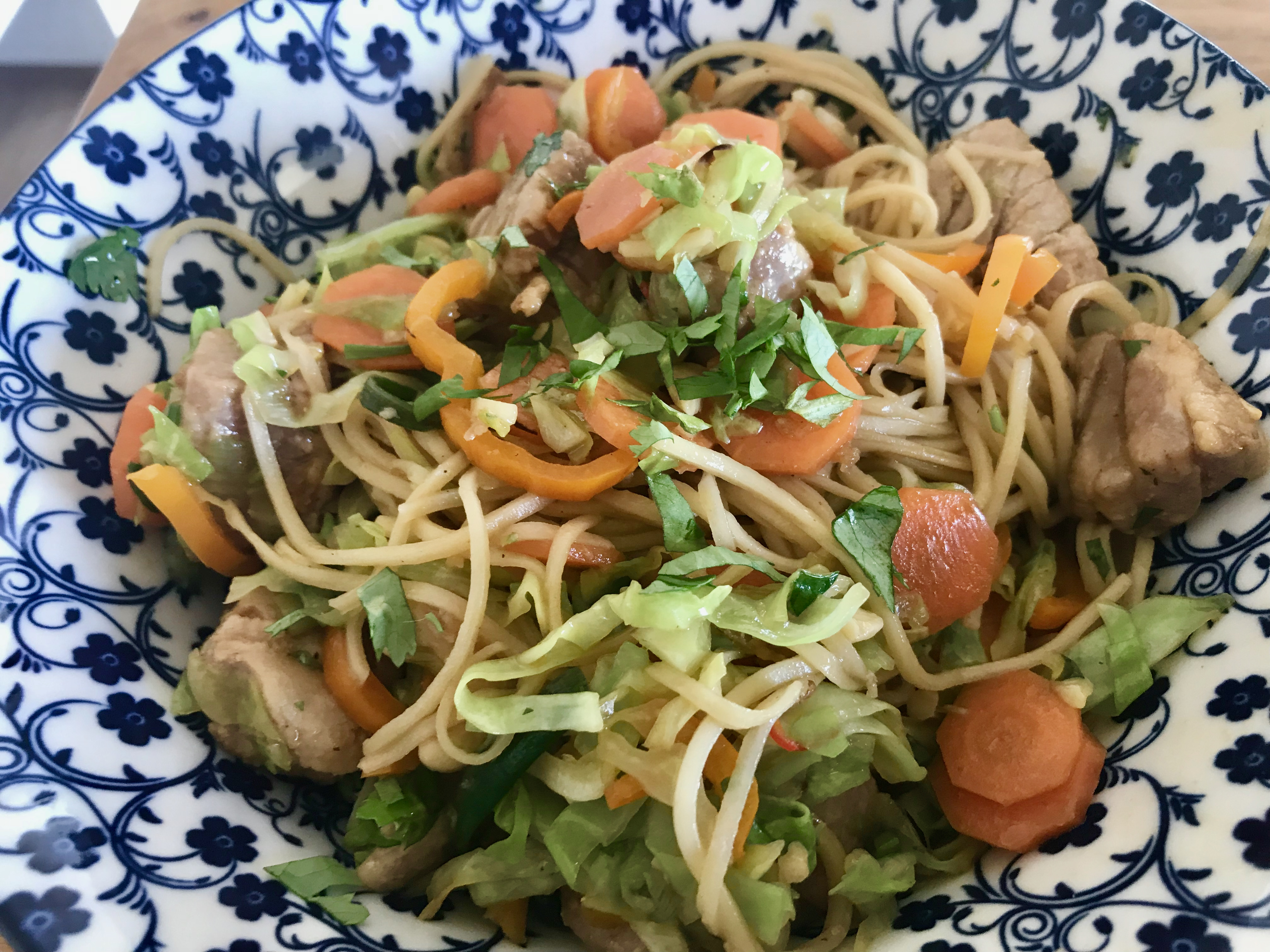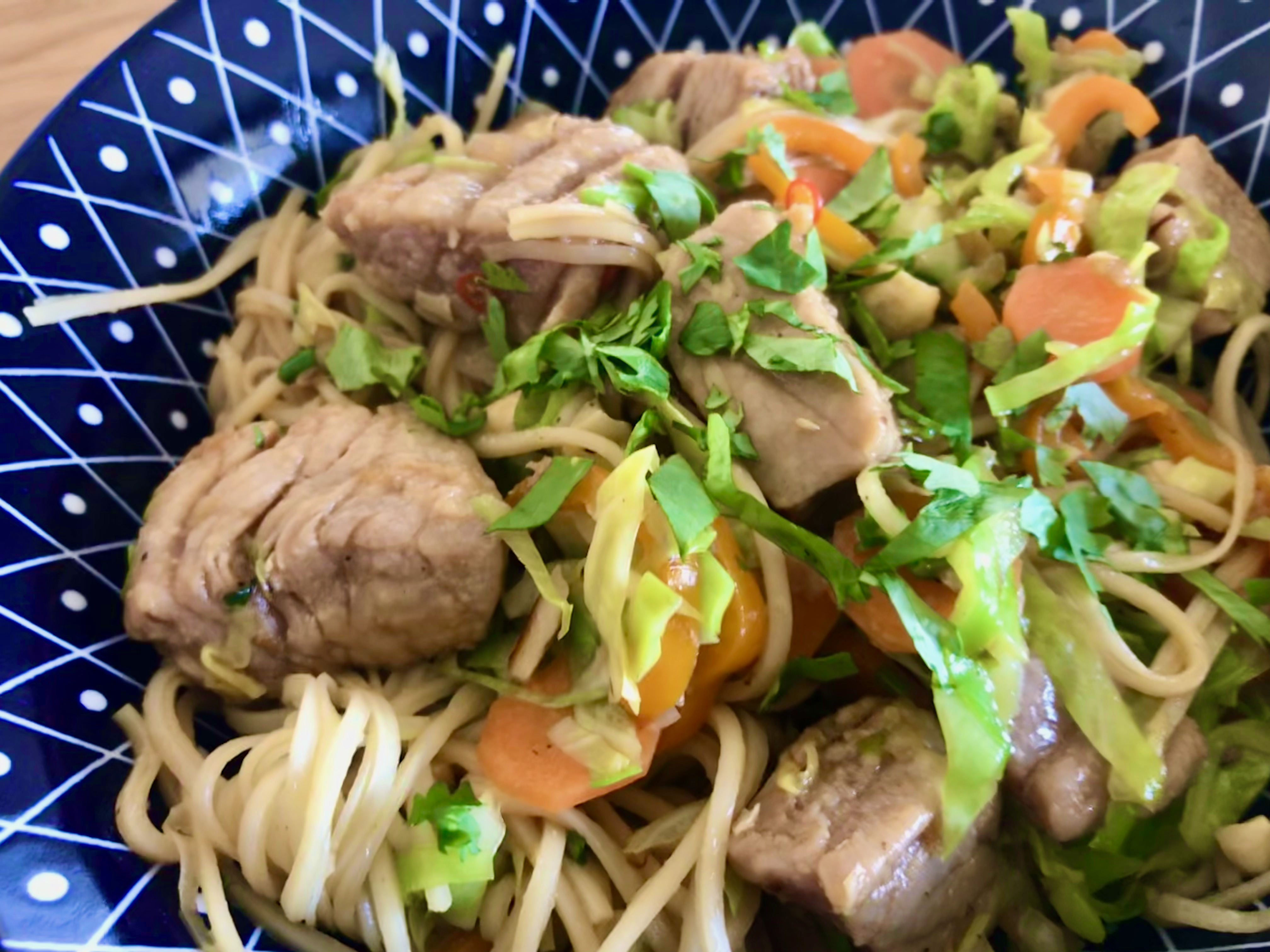 Das Gemüse fein schneiden und die Nudeln auf ein Sieb abgießen Gemüse und Cashewkerne für ca. 5 Minuten in einer heißen Pfanne mit Sesamöl braten. Die Nudeln dazugeben und mitbraten, die eingelegten Thunfischwürfel mit der Sauce dazugeben und einmal durchschwenken und mit Koriandergrün anrichten.