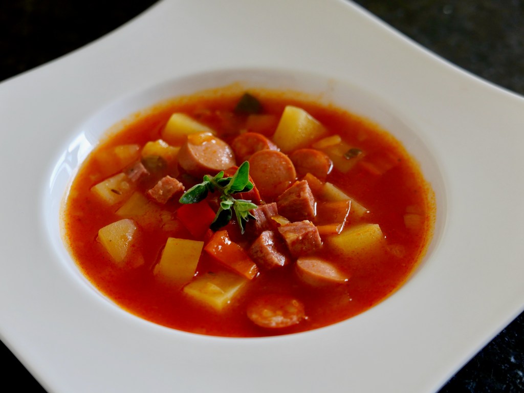 Essiggurkerl, Paprika & Wurst dazugeben und ca. 20 min köcheln lassen, abschmecken mit gehacktem Majoran und Salz würzen und mit frischem Gebäck (und Bier) servieren.