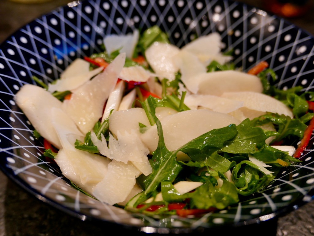 Spargel schälen und in ca 5 mm dünne, rautenförmige Scheiben schneiden. Paprika und Chili in dünne Ringe schneiden, Ruccola waschen, trockenschütteln und 2-3x teilen. Alles zusammen in eine Schüssel geben und mit Salz und Pfeffer würzen. Zitronenschale darüber reiben und die Zitrone darüber auspressen, Olivenöl und Trüffelöl dazugeben, vermengen und mit Parmesanspänen garniert servieren. Dazu passt perfekt ein italienisches Weißbrot, z.B. Altamura von Gragger & Cie. und ein Glas Pinot Blanc.