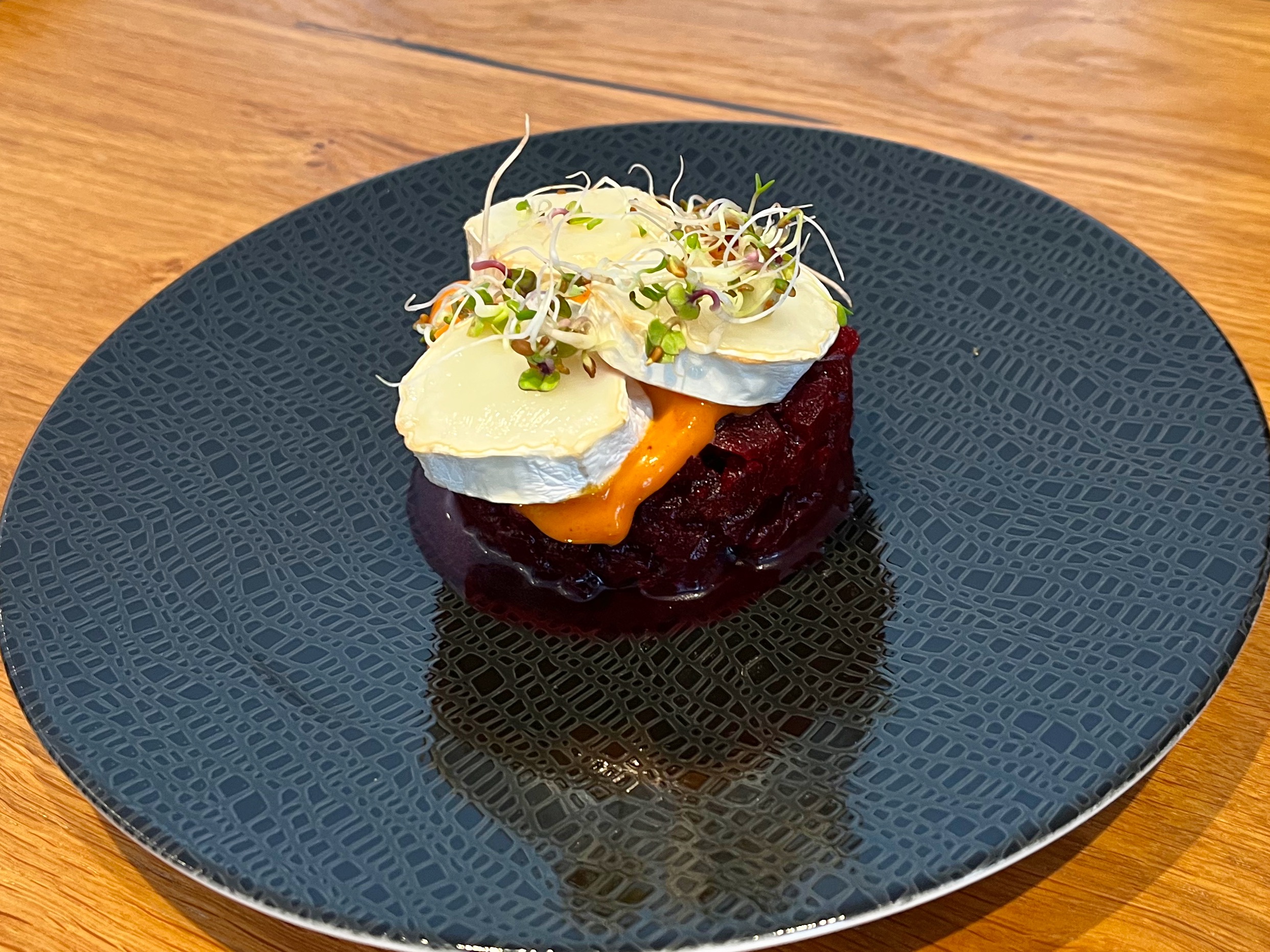 Währenddessen die Tartarmasse mit einem Metallring auf die Teller verteilen, Chilimayo on top und zuletzt noch den weichen, warmen Ziegenkäse drauflegen. Mit Microgreens garnieren – Fertig.
